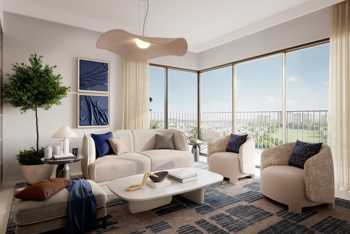 The architectural masterpiece delivers a refined version of contemporary beauty to redefine elegance to rejuvenate. The façade functions as a beautiful architecture ensemble which harmonizes modern design elements with timeless beauty. The exterior combines earth-inspired tones which merge perfectly with the natural environment. The building designs with their straight lines and large balconies with large windows present a powerful yet warm structure that fits perfectly with the course’s green landscape. Every architectural structure achieves environmental harmony through considerate material choices with textural elements thus providing residents with aesthetic functionality.