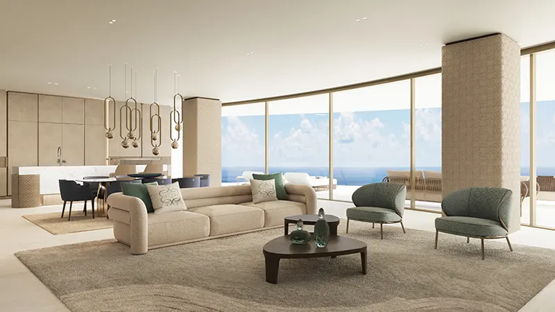 The architectural design emphasizes fluidity, from the towers’ curving facades to the elevated walkways that connect them, creating a seamless flow between luxury residences and shared spaces. This continuity extends to the expansive podium level, which hosts a carefully curated selection of premium retail and dining establishments. With direct beach access and a lush landscaped environment, offers residents and visitors an immersive experience where modern luxury meets serene coastal living.