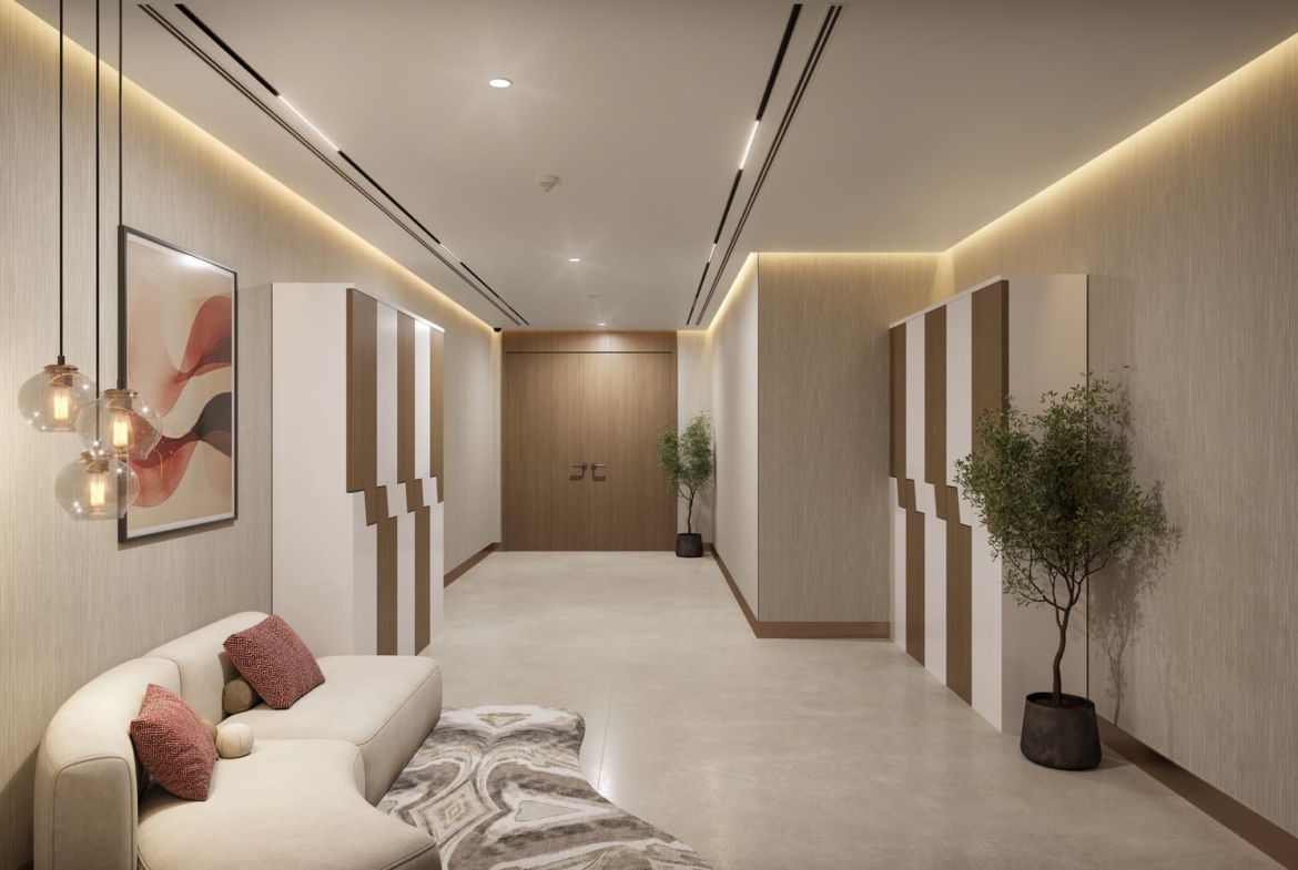 The development rises with modern geometry, blending private serenity and urban sophistication. It offers thoughtfully planned one- and two-bedroom apartments, designed to maximize usability and privacy. With floor-to-ceiling windows, refined finishes, and open layouts, residents are encouraged to create personalized interiors without compromising on natural light or functional flow.