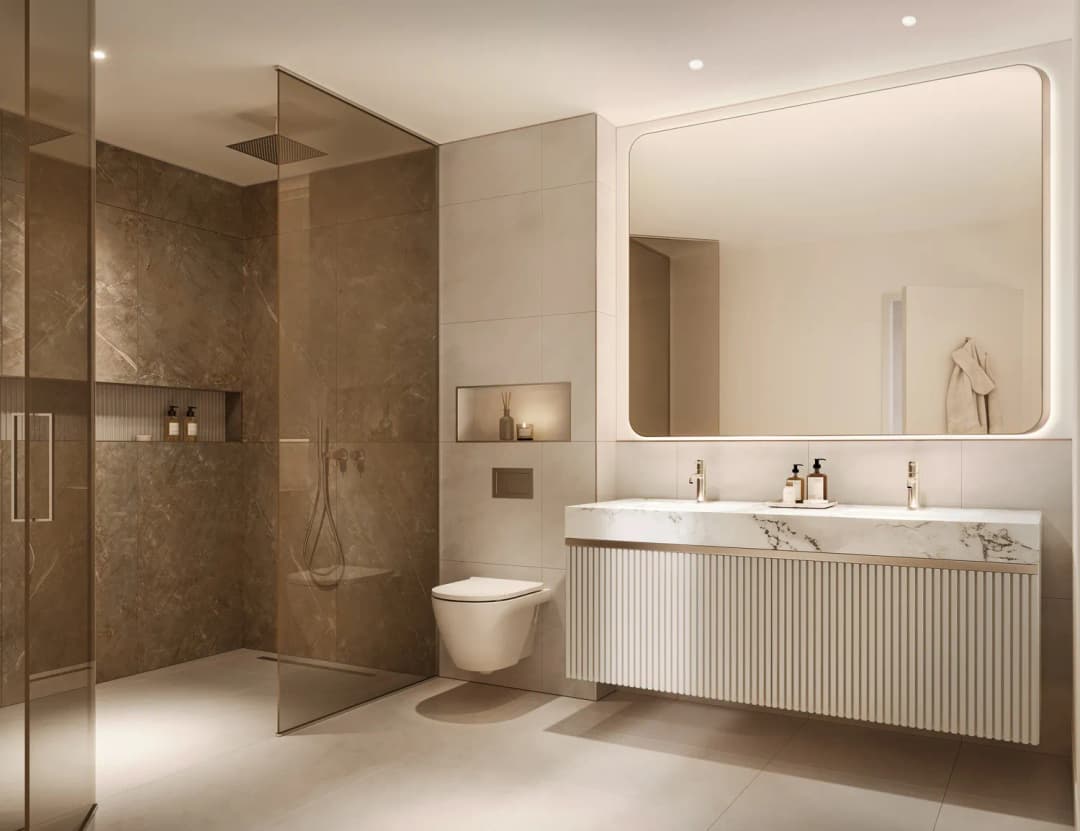 Inside, the residences are designed as sanctuaries of modern calm — refined spaces where natural light, organic textures, and clean geometry coexist. Open-plan living areas flow toward panoramic windows framing the city and water views, while muted tones and tactile materials bring warmth and sophistication. From one- to four-bedroom apartments and signature penthouses, every detail reflects Meraas’s dedication to intelligent design and understated luxury.