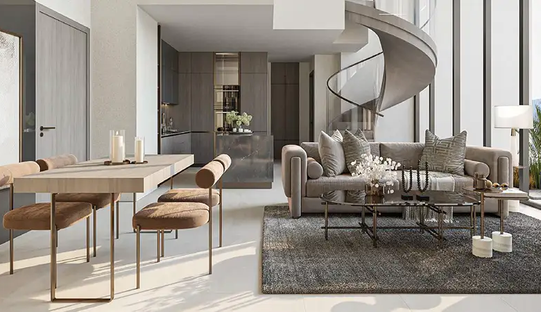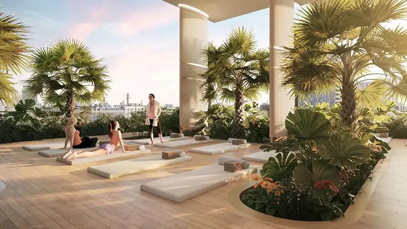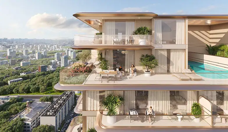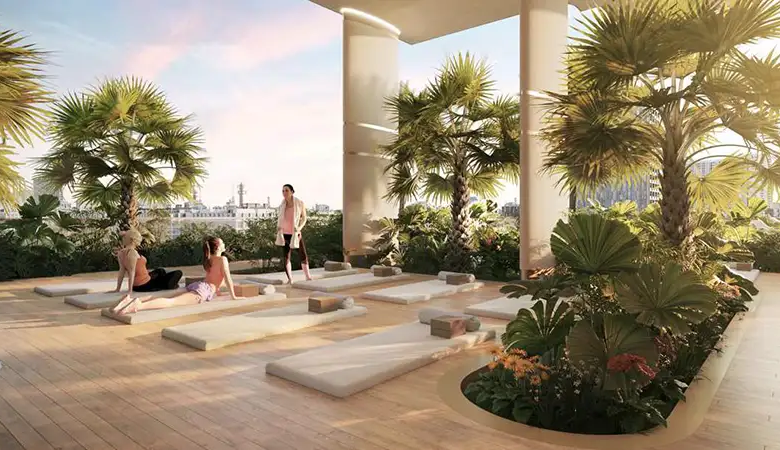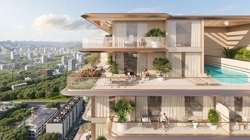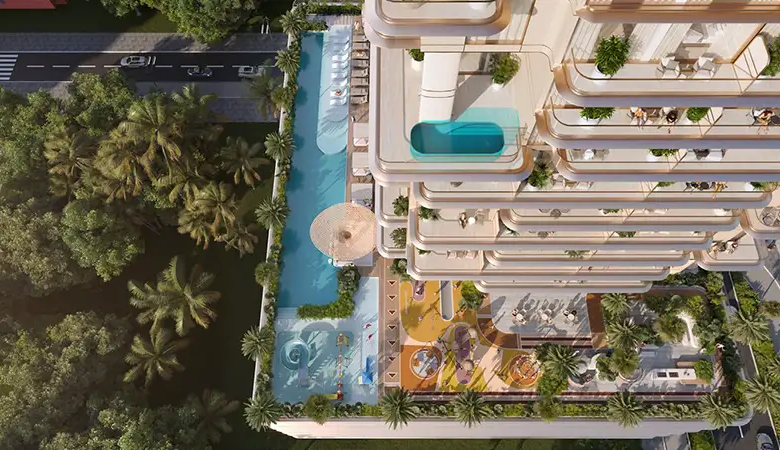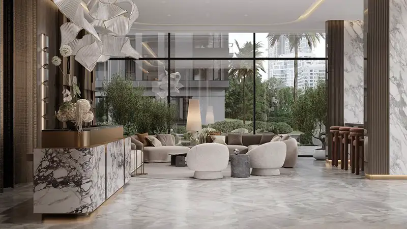 The architecture brilliance of this high-rise façade is rooted deep in its philosophy to provide a seamless flow of natural elements. The building curved and fluid design mirrors the movement of water, while its earthy tones resonate with the serene beauty of Dubai’s landscape. This thoughtful design integration not only enhances its aesthetic appeal but establishes a strong connection between residents and its surrounding environment. The façade is a testament to its innovative design, with protruding structure that hosts exclusive lifestyle and surrounding.